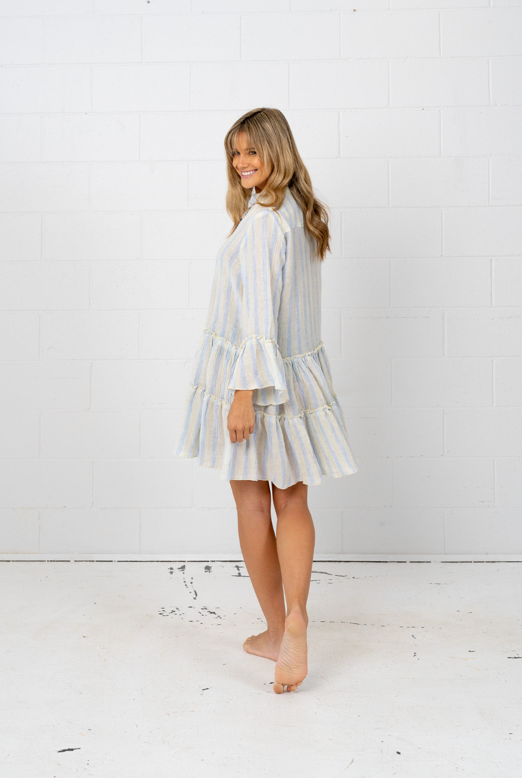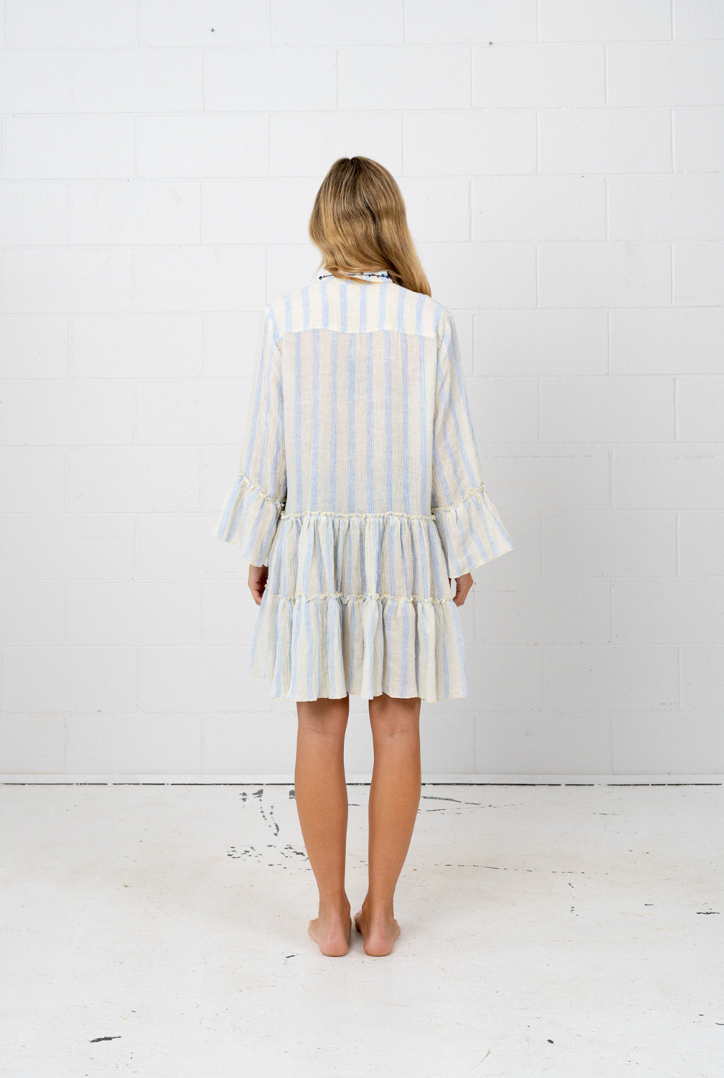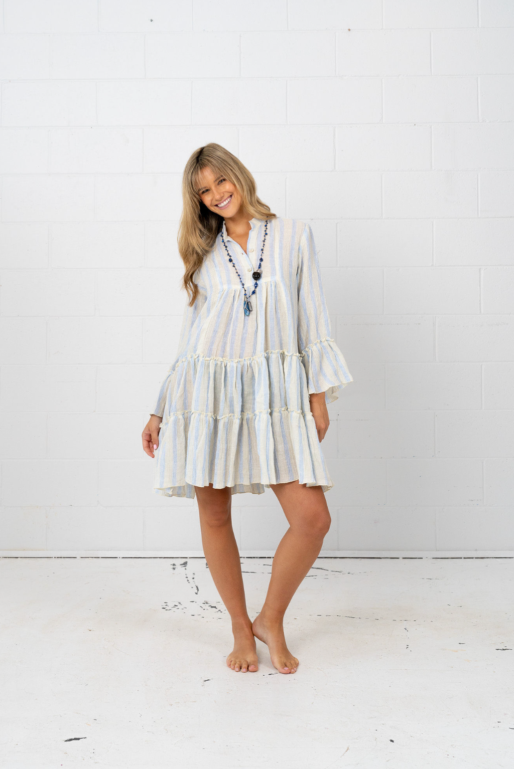 Dress with fluted 3/4 sleeves, V-neck and A-line with a tiered skirt from below the bust falling above the knee. The perfect summer dress that can go from beach to bar and beyond.